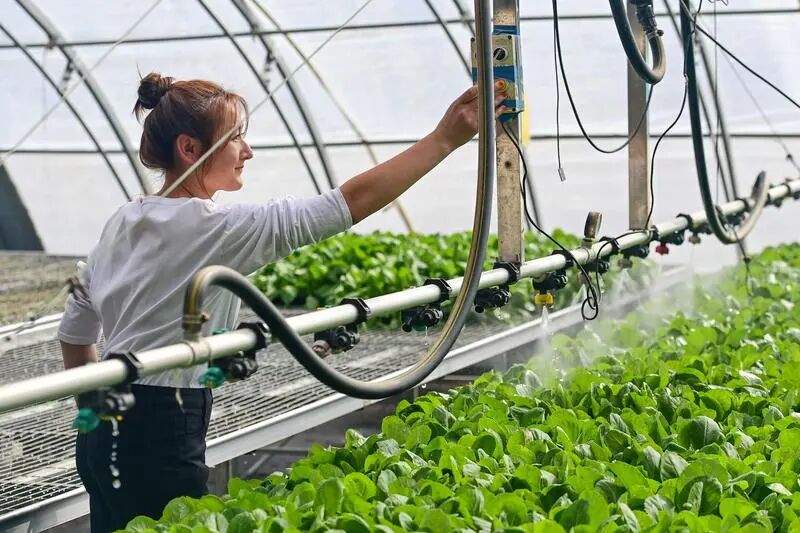 ▲在新疆阿克苏市阿依库勒镇的蔬菜基地,种植户操作喷淋设备为幼苗浇水。 新华社记者 丁磊 摄