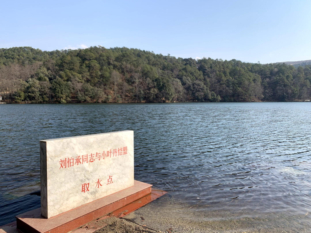 如今,取水处立有一块白色石碑,上书“刘伯承同志与小叶丹结盟取水点”字样。取水点不远处,彝海结盟的三块石头仍然保留。当年刘伯承年长,坐在北面稍高的石头上,小叶丹与他相向而坐,彝族毕摩(祭司)沙马尔各则坐在中间的石头上主持结盟仪式。