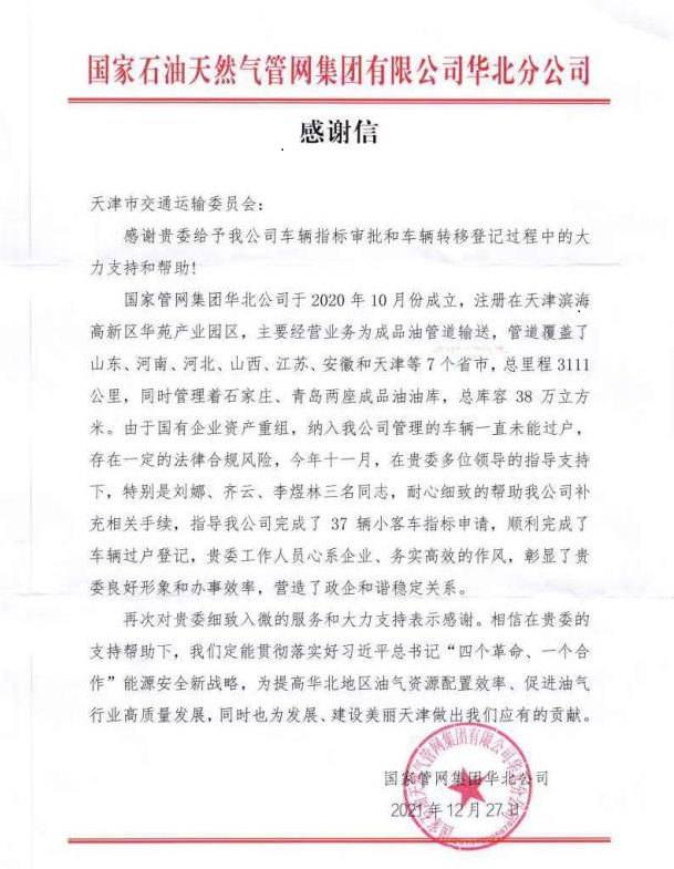 国家管网集团华北公司成立于2020年,主要经营业务为成品油管道输送,管道覆盖7个省市,同时管理着两座成品油油库,在国家管网集团全国成品油“一张网”中处于“北油南运”的核心枢纽地位。由于国有企业资产重组,公司亟需办理相关车辆过户手续,并派员到小客车调控窗口咨询办理重组调拨指标事项。在了解了企业实际需求后,窗口同志认真帮助企业梳理申请材料,并就企业的部分材料和相关情况向委业务处室进行了请示汇报。窗口同志根据批示意见持续跟进企业补充完善相关手续,协助企业及时申请指标并成功使用,解决了企业的燃眉之急,企业对小客车调控窗口人员的服务态度和工作效率给予了高度肯定。