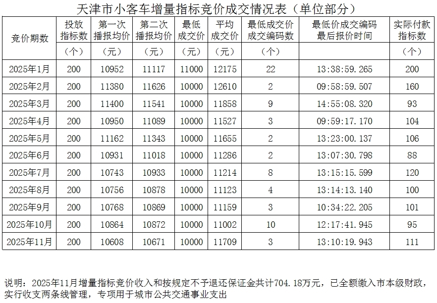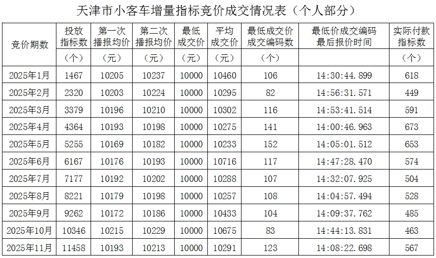 2025年天津小客车增量指标竞价成交情况表(截至11月)